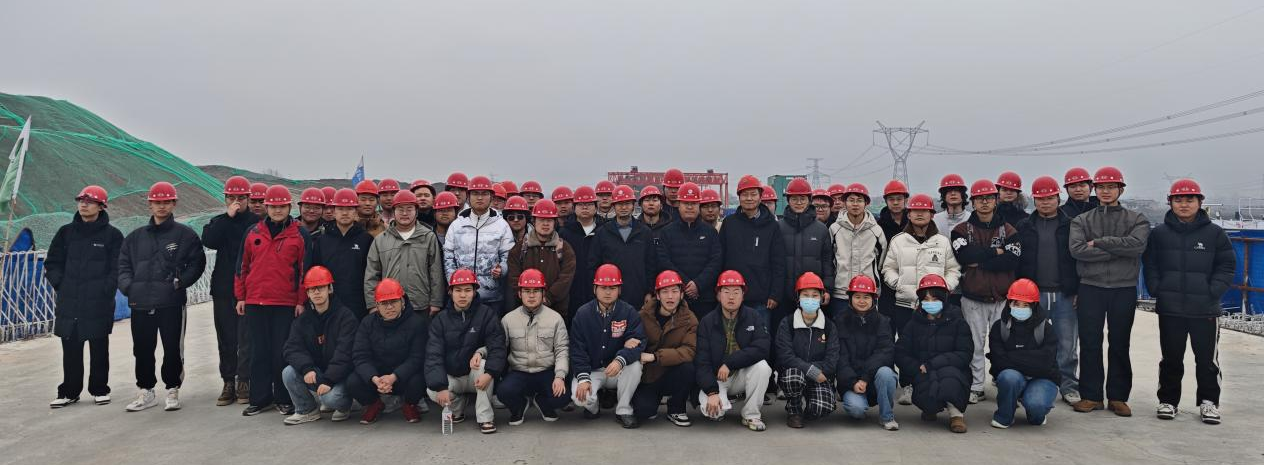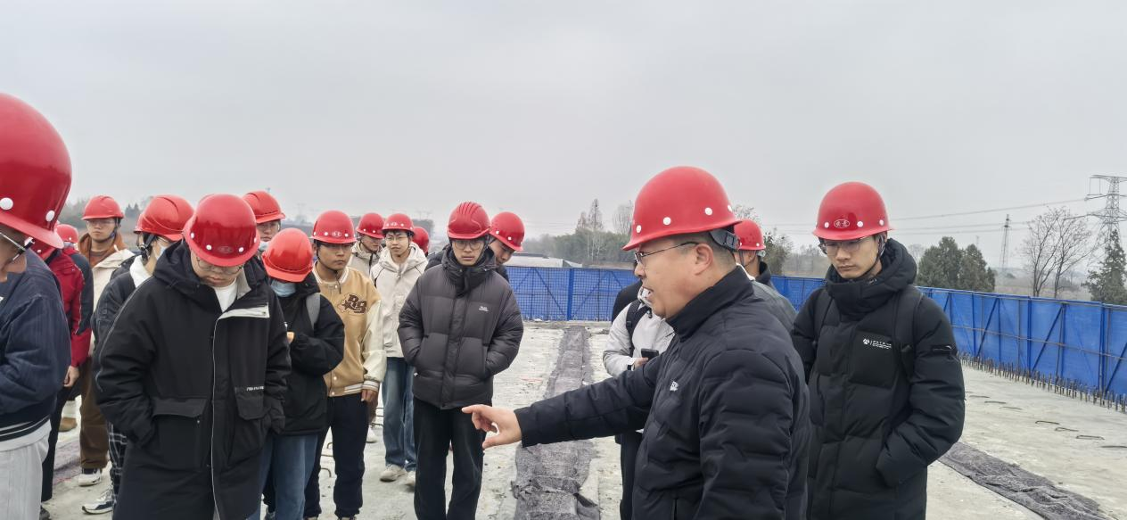 黑河大桥是鄠周眉高速建设的控制性工程,全长924m,上部结构为装配式预应力混凝土连续箱梁+变截面现浇预应力连续箱梁。全桥共14联,现浇连续箱梁4联,装配式预应力混凝土连续箱梁10联,25m预制箱梁100片,40m预制箱梁80片。宋总详细介绍了项目的基本情况和施工进展。在预制梁场,宋总详细介绍了预制梁现场制作的工艺:桥体底板、腹板、面板进行精准的吊装并采用“后张法”张拉预应力钢筋的方式进行施工,目前已完成右幅合龙。探索搭桥奥秘,链接知识体系,理论联系实际,浇筑职业底色。同学们结合土木工程专业体系学习,现场学习了桥体构件吊装、伸缩缝设置、桥面排水设计、钢筋防锈蚀、张拉预应力钢筋等施工环节的内容。(撰稿:刘洋 黄佳豪 审核:王丽娟)