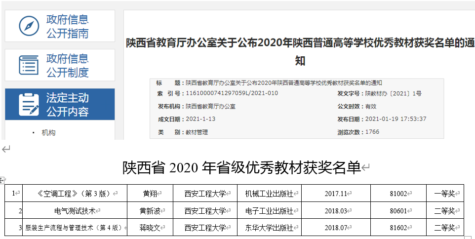 近日,陕西省教育厅印发《关于公布2020年陕西普通高等学校优秀教材获奖名单的通知》(陕教高办〔2021〕1号),bw必威西汉姆联官方网站黄翔教授主编的《空调工程》(第3版)获得省级优秀教材一等奖。