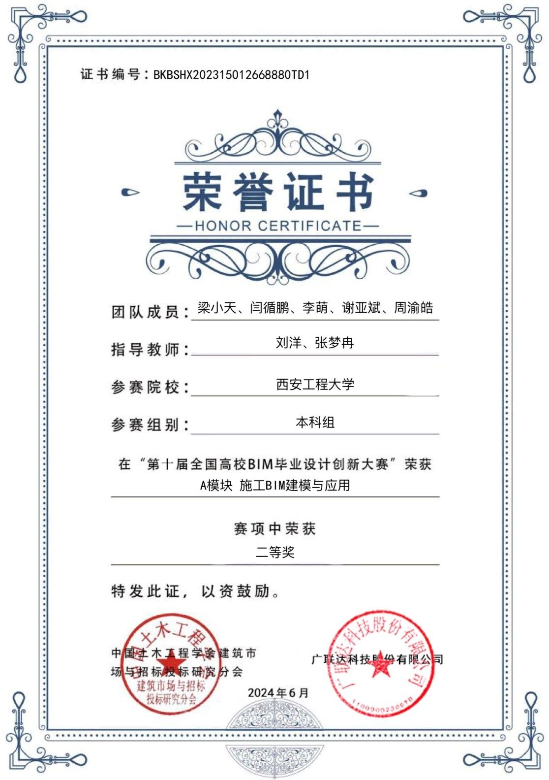 近日,必威西汉姆联官网学子在由中国土木工程学会建筑市场与招标投标研究分会、广联达科技股份有限公司联合主办的第十届全国高校BIM毕业设计创新大赛中喜获佳绩。本次比赛共吸引全国665所高等学校、12000余支团队、超过70000名师生参赛,全国总决赛共提交作品3984份,规模再创新高。经过激烈角逐,由必威西汉姆联官网土木工程专业21级学生梁小天、李萌、闫循鹏和22级学生周瑜浩、谢亚斌组成的鲜橙一队,在指导老师刘洋和张梦冉的指导下,荣获A模块“施工BIM建模与应用”赛项全国二等奖。