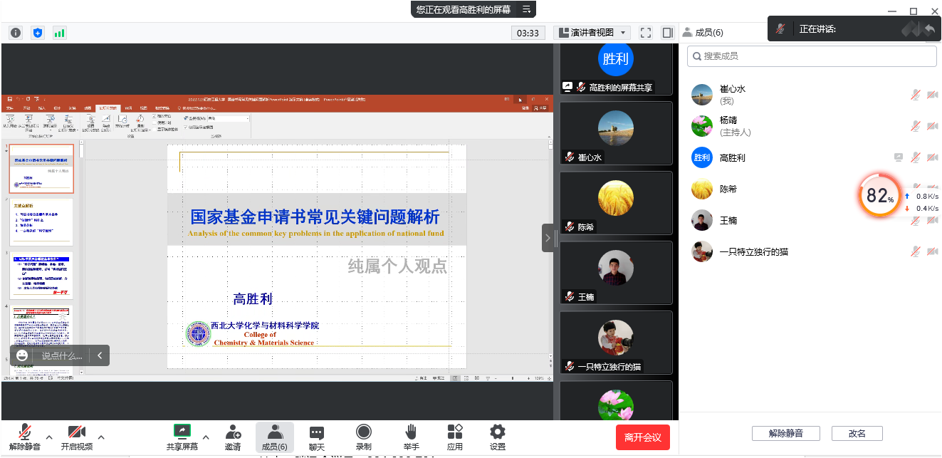 高胜利教授从评审专家的角度,结合个人申报国科基金的成功经验,从撰写标书要具备的条件、“创新性”是什么、细节分析和“科学属性”的确定等四个方面进行了详细指导,接着他听取了相关老师拟申报项目的汇报,并从申报选题、标题凝练、立项依据、研究内容、技术路线、创新点和可行性分析等方面给出了中肯而具有操作性的修改意见和建议,最后就相关问题与老师们进行了深入地交流。
