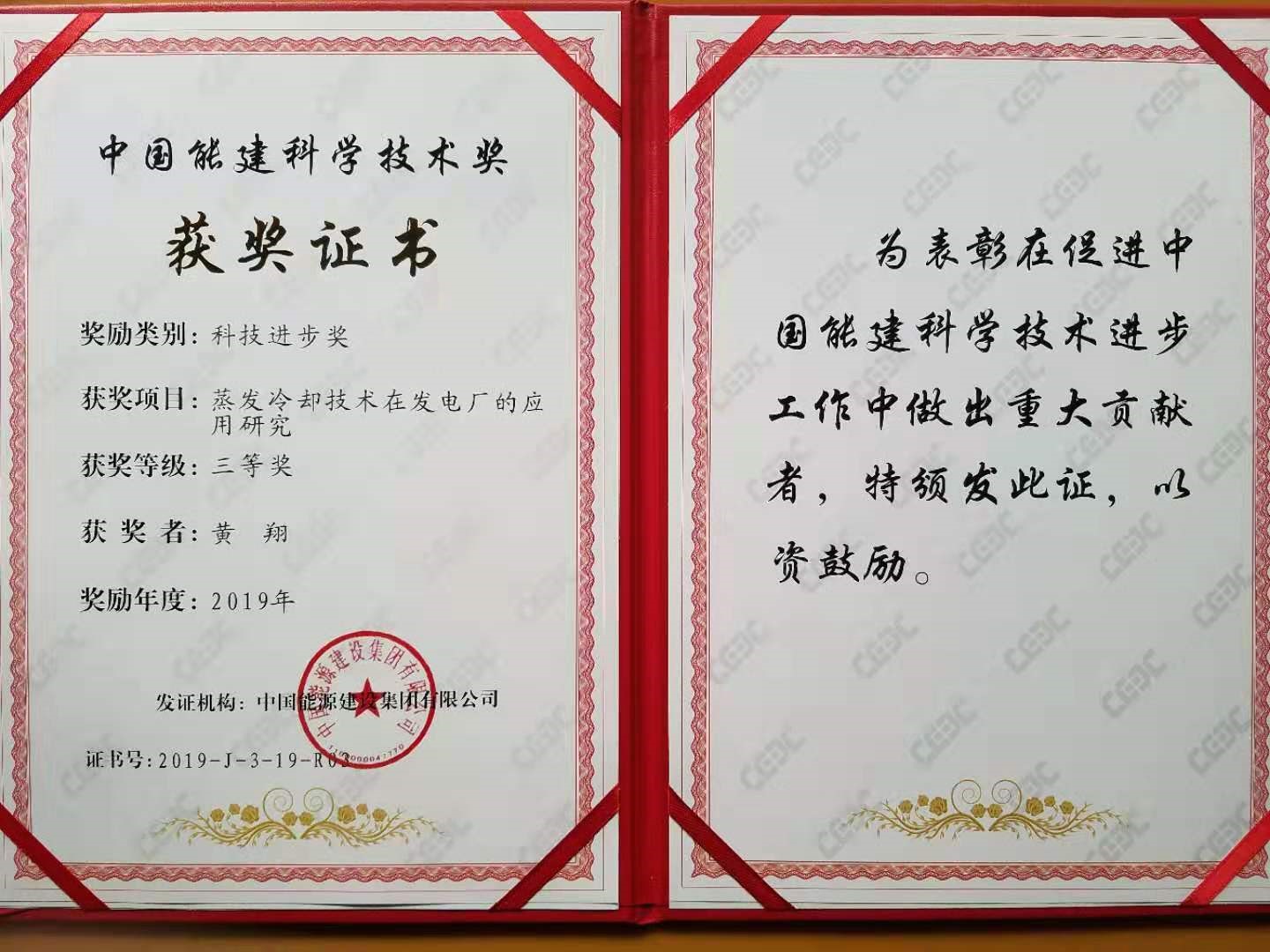 “中国能建科学技术奖”奖项由中国能源建设集团审核并备案,旨在调动能源建设领域工作者的积极性和创造性,奖励能源建设应用中的科技创新成果和科技创新产品,为提高科技创新以及国家节能减排事业做出的重要贡献。本次评选共99个项目入围,经形式审查、专家网评、专业组初评、科技委终评等多个环节严格筛选,最终确定了48个获奖项目,含3项技术发明奖项目、45个科技进步奖项目。获奖项目中,由中国电力规划设计总院有限公司、bw必威西汉姆联官方网站、中国电力工程顾问集团华北电力设计院有限公司、中国电力工程顾问集团西北电力设计院有限公司、中国电力工程顾问集团华东电力设计院有限公司等5个单位联合申报的“蒸发冷却技术在发电厂的应用研究”项目荣获中国能建科学技术三等奖。