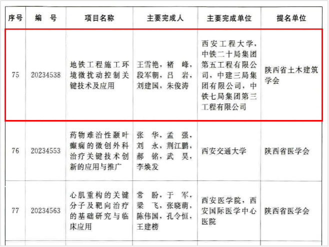 近日,陕西省人民政府发布了“陕西省人民政府关于2023年度陕西省科学技术奖励的决定”,以bw必威西汉姆联官方网站为第一完成单位,bw必威西汉姆联官方网站王雪艳老师、褚峰老师为第一、第二完成人的项目《地铁工程施工环境微扰动控制关键技术及应用》荣获三等奖!