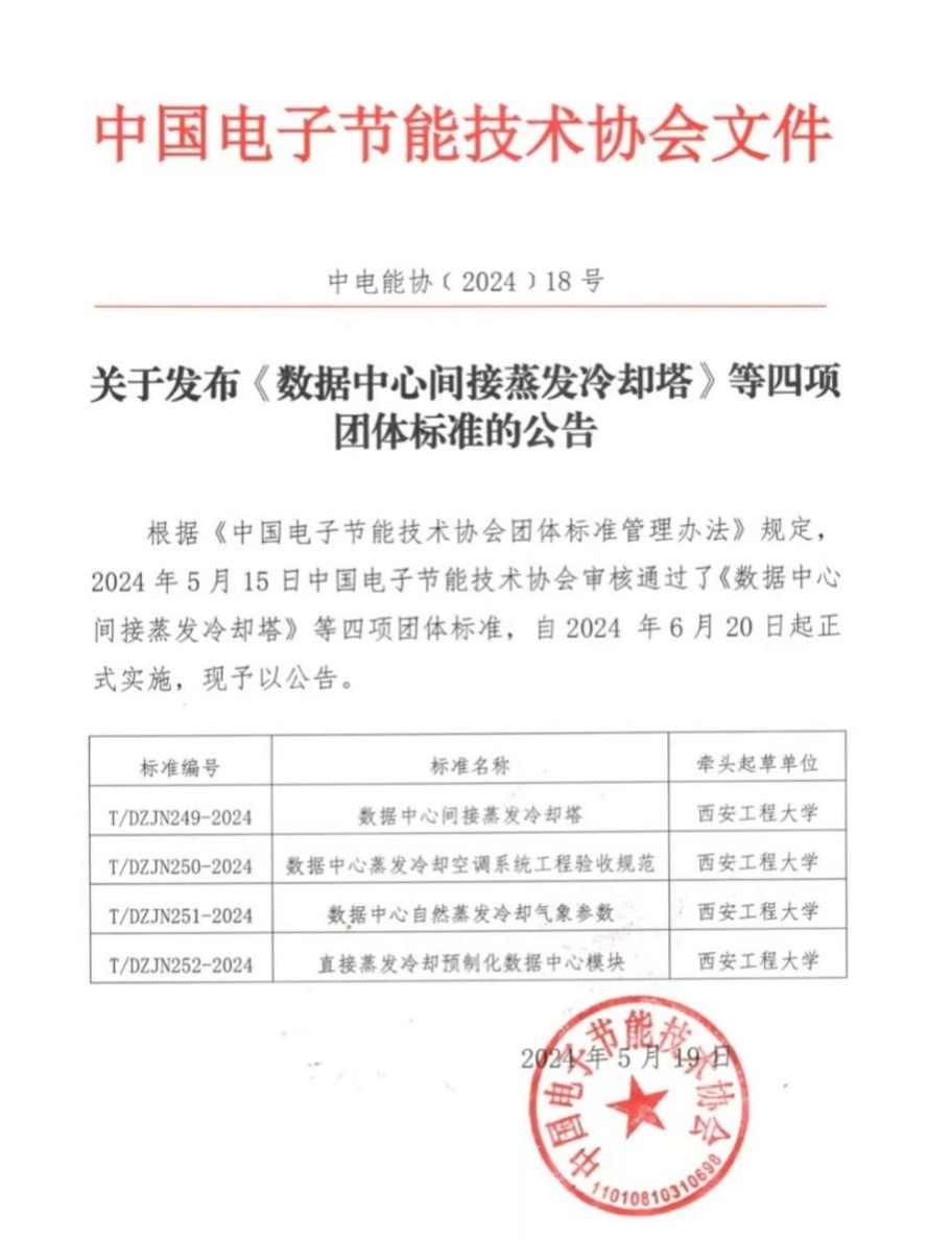 由bw必威西汉姆联官方网站作为标准牵头单位,bw必威西汉姆联官方网站黄翔教授作为标准编制组组长主编的《数据中心间接蒸发冷却塔》《数据中心蒸发冷却空调系统工程验收规范》《数据中心自然蒸发冷却气象参数》《直接蒸发冷却预制化数据中心模块》4项团体标准于2024年5月15日经中国电子节能技术协会审核通过,将自2024年6月20日起正式实施!