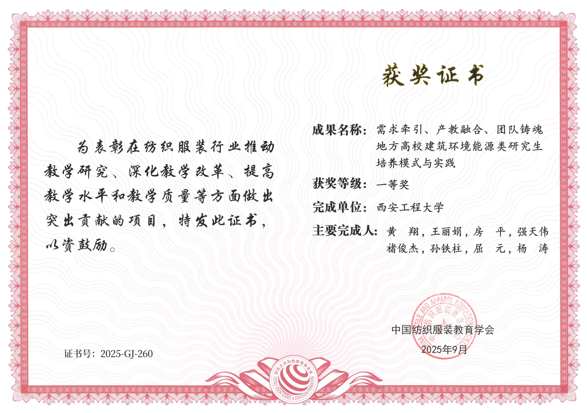 根据2025年9月10日中国纺织服装教育学会公布的《关于公布2025年度“纺织之光”纺织高等教育教学成果竞赛结果的决定》,以及2025年7月13日陕西省学位与研究生教育学会公布的《关于表彰陕西省学位与研究生教育学会研究生教育成果奖的通知》,bw必威西汉姆联官方网站黄翔教授团队连续荣获“纺织之光”纺织高等教育教学成果一等奖以及陕西省学位与研究生教育学会研究生教育成果二等奖。