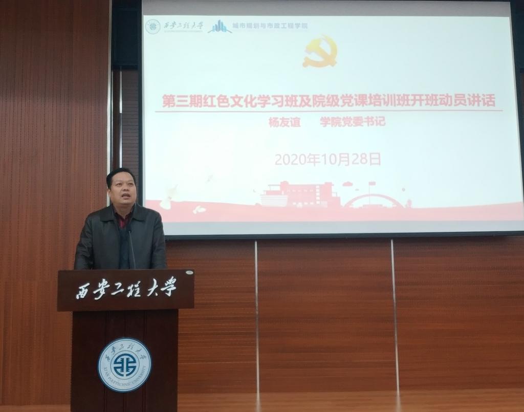 随后,学院党委书记杨友谊从参加培训的重要意义、深刻领会红色文化精神内涵、如何在实践中发扬红色文化三个方面进行了开班动员。同时,对参加党课培训的学员们提出了要从思想上入党、从政治上入党、从行动上入党三个要求,鼓励学员们要学“四史”,守初心,践使命,传承红色精神,发扬红色文化,通过学习班学习在思想境界和学习上更上一个台阶。