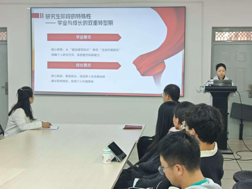 会议第一项以“研”途领航,党员先行为主旨,由张思源同志为新生党员开启研究生党员第一课。张思源同志首先点明研究生阶段是学业上从“被动接受知识”到“主动开展研究”的科研能力转型期,是成长中面临就业、深造选择的人生关键期;随后强调党员身份的“双引领责任”,明确研究生党员需在学业上以扎实科研成果树标杆,在思想上以坚定信念引方向,更要将研究方向对接新型城镇化市政基础设施建设,实现“个人发展与国家需求同频”。研究生党员的“研途领航”不仅是个人的学业精进,更需履行党员服务奉献、先锋引领的义务——既要将党的创新理论学习与科研选题结合,让课题设计贴合社会需求,也要主动承担校内服务,将专业知识转化为服务社会的能力。整场讲解既有理论高度,又有实践温度,让新生党员深刻理解“学业规划不是简单的时间安排,而是党员使命在科研领域的具体践行”,为其快速适应研究生生活、明晰党员责任提供了清晰指引。