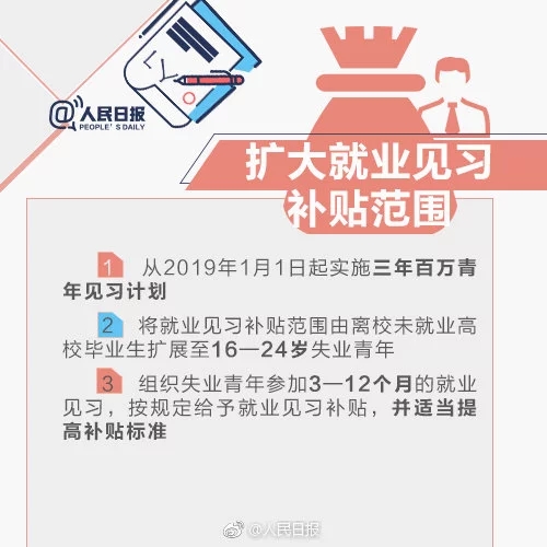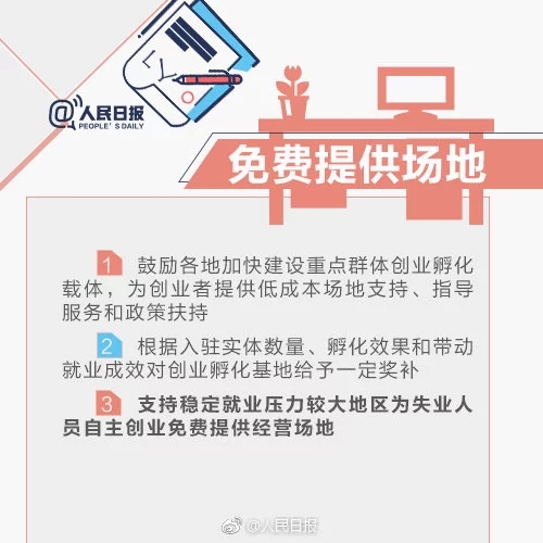 ①符合条件的个人和小微企业,可分别申请最高不超15万和300万创业担保贷款;②支持就业压力较大地区为失业人员自主创业免费提供经营场地;③将就业见习补贴范围扩展至16—24岁失业青年!!