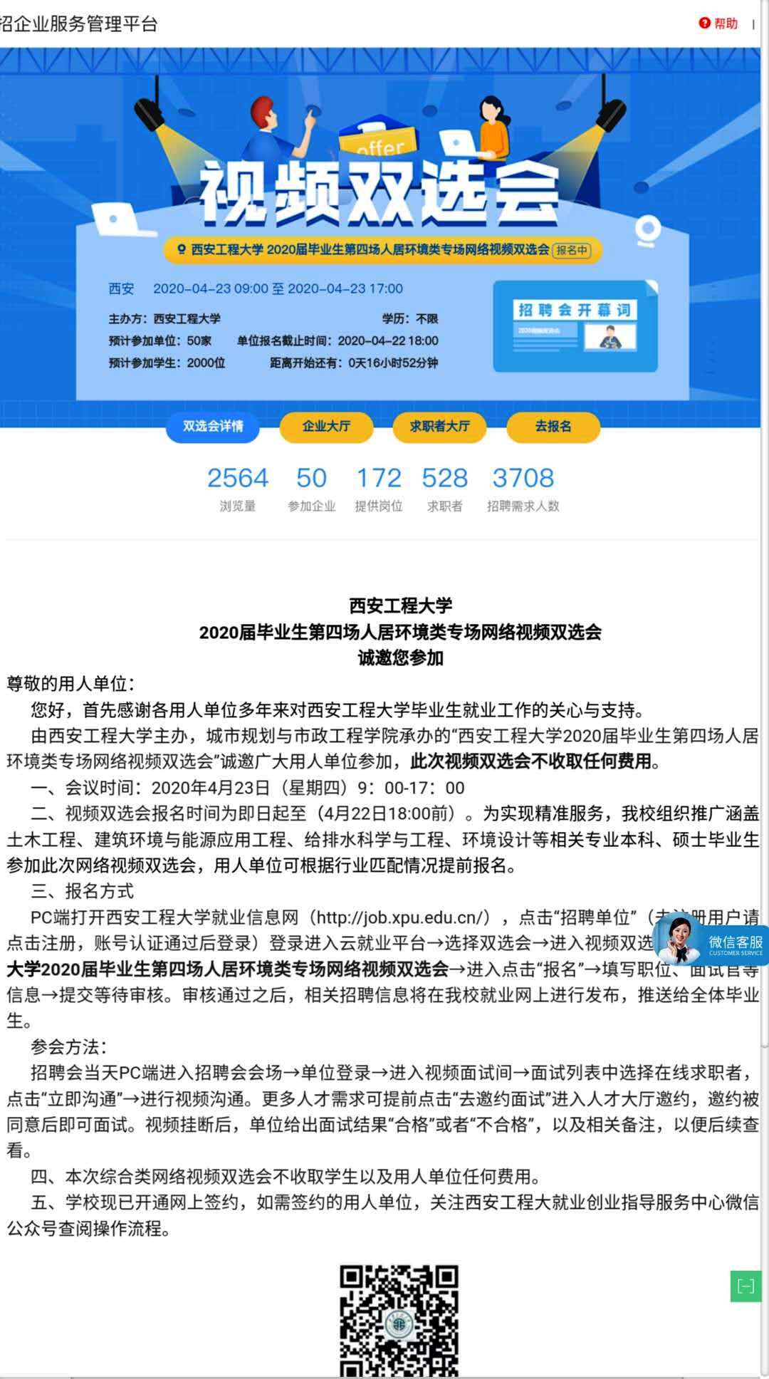 学院前期通过积极发动导师及学院专业教师,深挖周边就业资源,依托校友资源网络等多方联动,主动作为,目前参加4月23日“bw必威西汉姆联官方网站2020届毕业生第四场人居环境类专场网络视频双选会”的单位有52家,提供就业岗位172个,报名参加的各专业同学500余人。