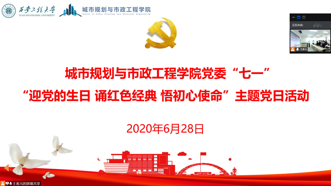 党日活动最后,杨友谊讲话并要求,中国共产党走过了99周年的光辉历程,留下了宝贵的精神财富,希望学院全体党员认真领悟、学习,一是在99周年组织活动中坚守共产党人的初心使命,将初心使命体现到个人的言行举止和身体力行上来;二是认真践行“厚德弘毅博学笃行”的校训,团结奉献,传承创新,要牢记立德树人根本任务,干事业、育新人,学生党员要牢记党的初心使命,争先锋、做新人;三是通过学习与实践,提升党性、成长成才、担当履职,为打赢防疫总体战和学校事业发展贡献力量。