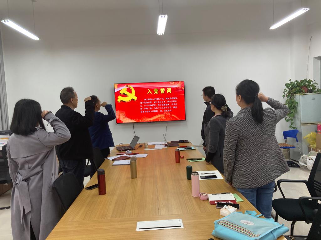 活动开始后,大家首先观看了短视频《中国共产党百年述职报告》,一起感受了中国共产党用鲜血、汗水、泪水、勇气、智慧和力量写就的百年历史。看完中国共产党100年来的艰辛历程和辉煌成就,党员们深感红色政权来之不易、新中国来之不易、中国特色社会主义来之不易!随后,大家一起面对党旗再次宣誓,重温了入党誓词,还一起跟唱学习《中共党员入党誓词歌》,重忆入党初心。