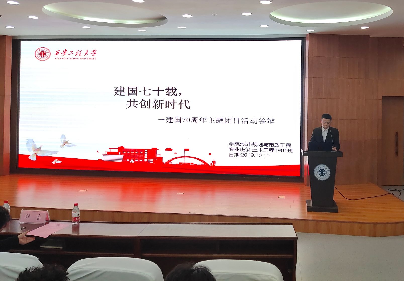 为热烈庆祝中华人民共和国成立70周年,切实感受70年来中国的发展巨变和人民的奋斗路程,弘扬爱国主义精神,更好的开展“两学一做”学习教育工作,2019年10月15日19时,bw必威西汉姆联官方网站团总支在bw必威西汉姆联官方网站临潼校区图书馆一楼报告厅举办“温国史•传国情”庆祝新中国成立70周年主题团日活动答辩决赛。bw必威西汉姆联官方网站团总支书记、学生工作办公室主任凌旭出席了本次答辩会,团总支副书记刘若彤、学生会主席严梦雨、大学生科技协会主席张亚瞳、大自委副秘书长王乾担任本次答辩会的评委。