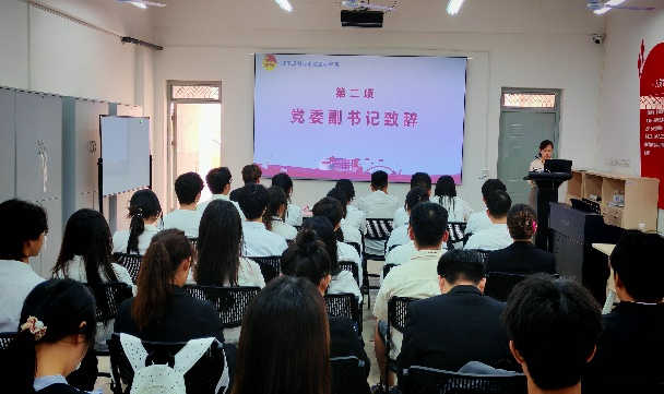 紧接着,鱼园代表学院致辞,向新团员致以热烈祝贺,也提出殷切期望。她强调共青团员这一身份不仅是一份崇高的荣誉,更是一份沉甸甸的责任与使命。希望新团员们以团章为指引,将个人理想融入国家发展大局,坚定理想信念,主动学习党的理论知识,积极向党组织靠拢。更要在学习生活中锤炼本领,勇挑重担,以实际行动践行“请党放心,强国有我”的青春誓言,成长为有理想、敢担当、能吃苦、肯奋斗的新时代好青年。