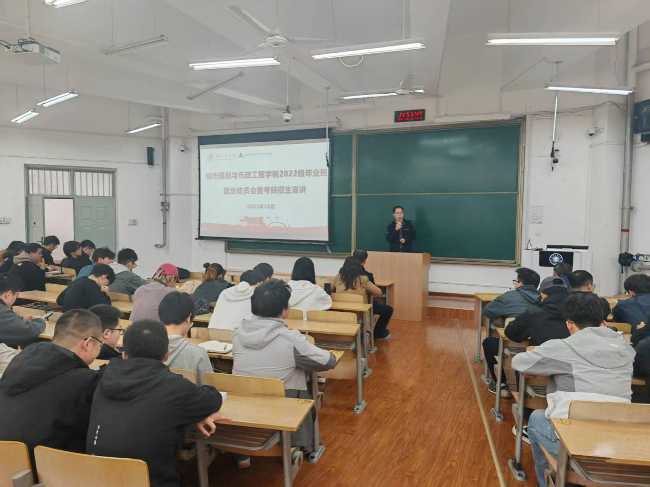 各系主任分别立足本专业特点,进一步阐释了各专业在就业市场中的优势与发展潜力,为学生提供了更为具体的职业发展方向建议,并开展了考研动员。靳贵铭指出建环专业在绿色建筑与节能环保领域的广阔前景,建议同学们关注行业动态,提升实践能力;崔心水聚焦市政专业,分析了城市基础设施建设带来的就业机遇,鼓励学生积极参与实际项目以积累经验;刘洋则强调土木专业在大型工程与智能建造方面的潜力,激励同学们勇于创新、追求卓越。