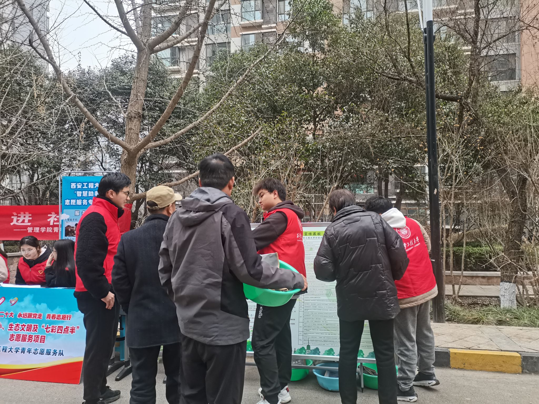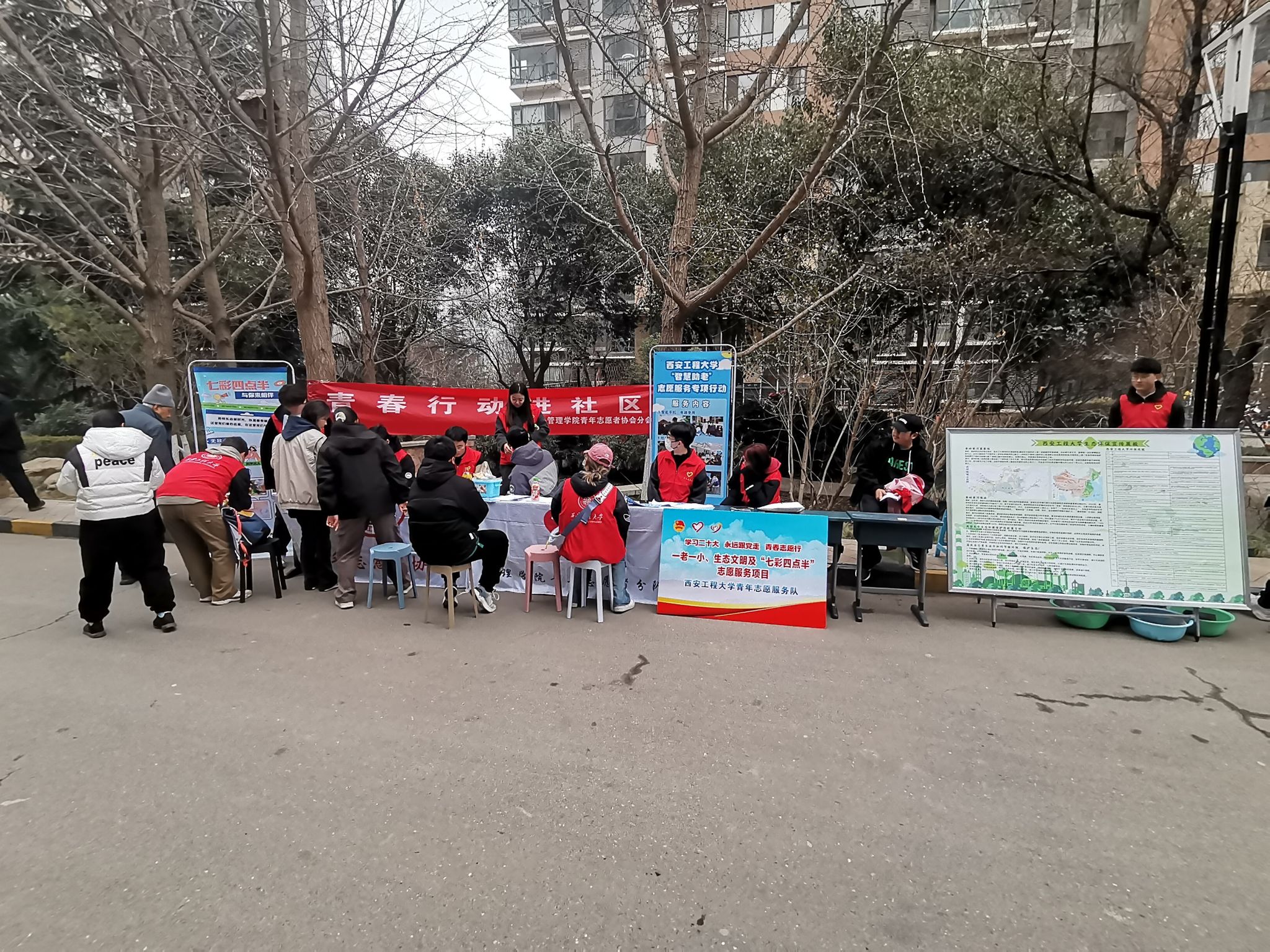 早上七点,支部的团员们携带物资历时2个小时前往活动点。在社区,每位团员都热情的向路过的社区居民分发保护“中华祖脉”秦岭的行动彩页,分享美丽秦岭对我们生活方方面面的有益影响,并展示我校师生团队多年来在生态保护领域的可贵成果。