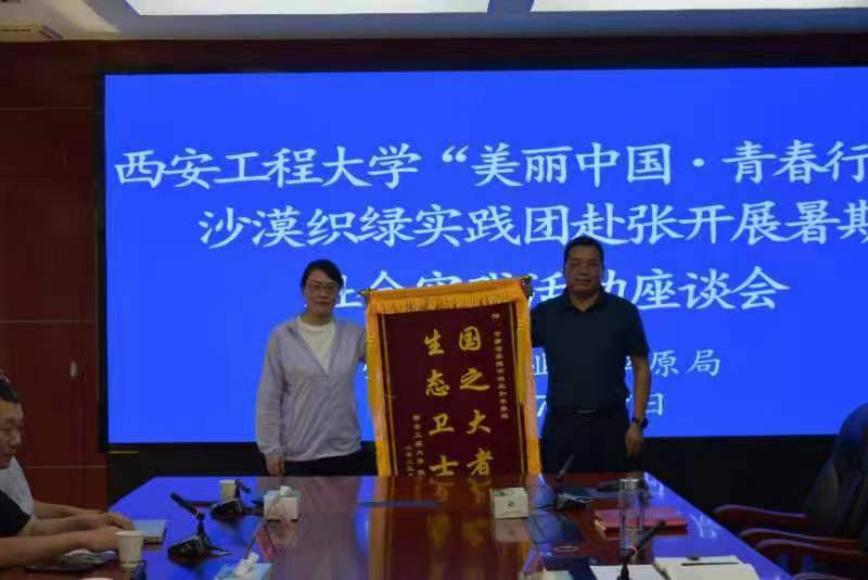 为表达对张掖市林业和草原局在持续推进“一屏一带一廊一城”生态功能区和荒漠化治理取得成就地敬意,副教授罗萌代表实践团向张掖市林业和草原局赠送“国之大者,生态卫士”锦旗。