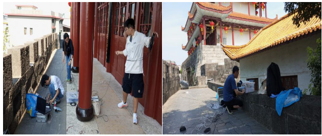 在为期6天的实地检测中,实践团运用先进的无损检测技术,对武冈古城墙的墙体、城门等关键部位进行了全面检测。团队成员通过在城墙不同位置布置传感器,记录城墙在环境激励下的振动响应,以此分析城墙的动力特性,包括自振频率、阻尼比等参数。这些参数对于评估城墙结构的完整性和稳定性至关重要。团队成员魏茜和康清煜共同负责数据处理与分析工作,凭借在结构动力参数提取方面的专业能力,为团队检测数据的有效性提供了重要支撑。此外,团队还对城墙的外观进行了详细勘查,记录墙体表面的裂缝、风化等病害情况。