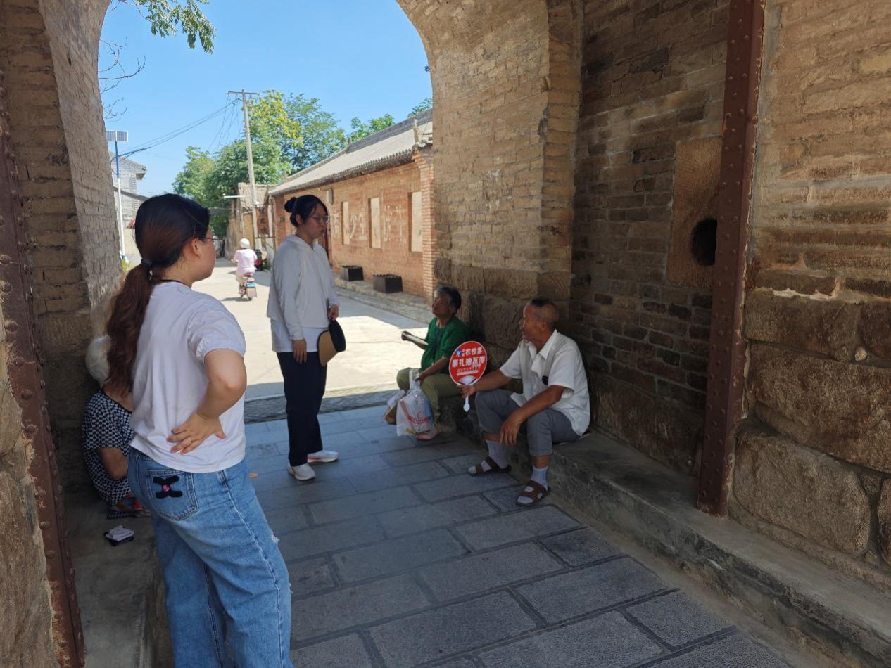 上午十时,团队成员在杜倩老师的带领下抵达南豆角村开展调研,针对村中重要节点,如由夯土构筑的古城门、看尽时代变迁的千年侧柏、历经风吹雨打威严不改的社公爷雕像等进行了详细的了解、记录、研究。