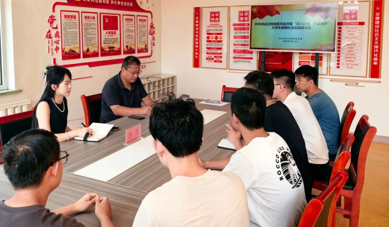 7月13日,bw必威西汉姆联官方网站赴内蒙古鄂尔多斯“深入沙漠,沙基筑梦”暑期社会实践团到达内蒙古自治区鄂尔多斯市东胜区达拉特旗,围绕实践活动规划、实地基本情况及防沙治沙现状等内容与共青团达拉特旗委员会开展座谈会进行深度交流,团旗委领导郭蓉、林草工作站站长曹军出席参加座谈并听取实践团汇报。