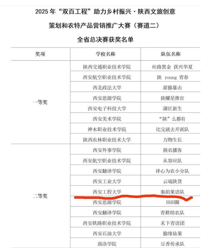 2025年“双百工程”助力乡村振兴·陕西文旅创意策划和农特产品营销推广大赛(赛道二)省级选拔赛圆满落幕。由“田园守望者-助力乡村振兴”项目成员邸子涵、翁俊杰、徐思齐、于建城、张超、周书锦组成的“秦韵果语队”参赛团队,凭借“秦校联动·助力乡村振兴”的创新实践项目,一路过关斩将,最终斩获省级二等奖,用青春力量书写了消费助农与文化赋能的双重答卷。
