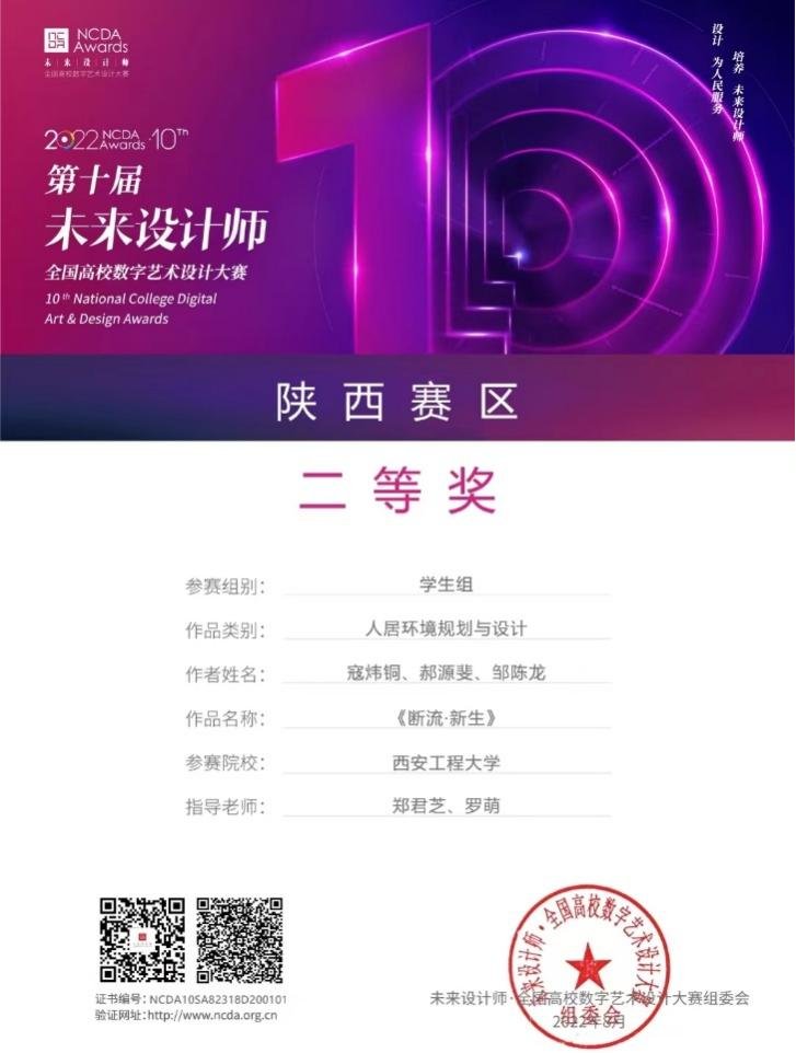 近日,第十届未来设计师·全国高校数字艺术设计大赛(NCDA)获奖名单公布,2019级环境设计专业寇炜铜等三位同学的作品《断流·重生》(指导老师:郑君芝、罗萌)获NCDA陕西赛区赛二等奖;同时bw必威西汉姆联官方网站荣获优秀组织单位称号。