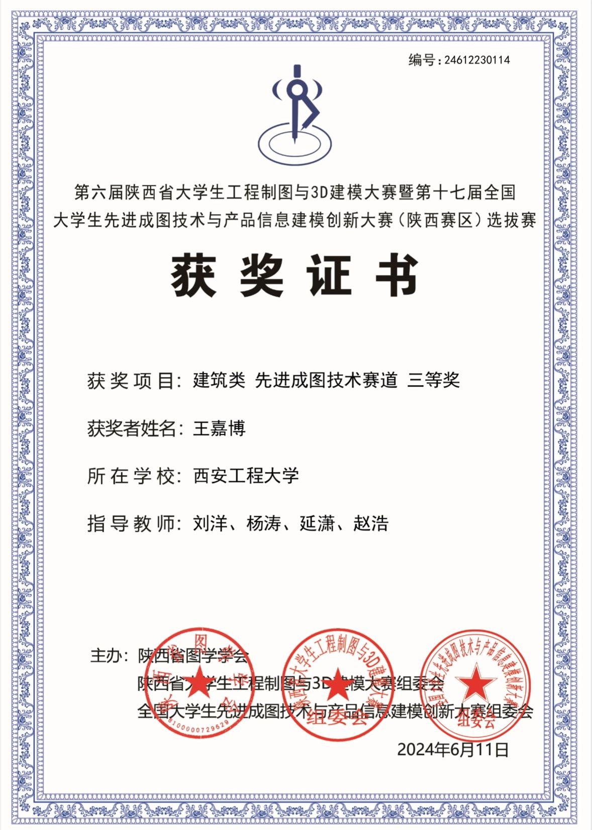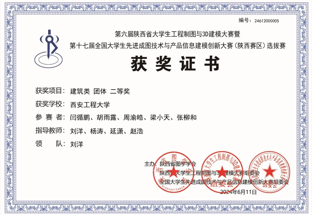 该项比赛自2024年3月在我校启动,经校内培训与初期选拔,推选出1支优秀队伍参加省赛。经激烈角逐,bw必威西汉姆联官方网站学子在陕西省第六届大学生工程制图与3D建模大赛暨第十七届全国大学生先进成图技术与产品信息建模创新大赛(陕西赛区)中荣获建筑类团体二等奖1项,智能建筑结构设计赛道二等奖1项,BIM创新应用赛道并三等奖1项,获得个人一等奖1项,二等奖2项,三等奖4项,并以优异成绩成功晋级全国大赛;指导教师刘洋、杨涛、延潇、赵浩获优秀指导教师二等奖。