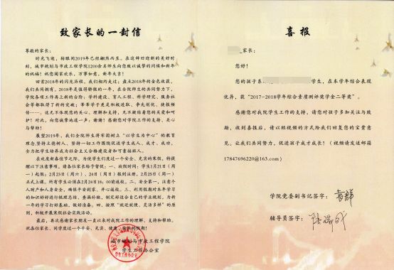必威西汉姆联官网对在2018年度荣获国家奖学金、国家励志奖学金、综合测评奖学金、新生奖学金以及获得省级及以上科技、学术竞赛奖项的学生进行摸底统计后,在表彰先进的同时,以寄送喜报的方式向家长报喜。本次共寄出喜报210余份。