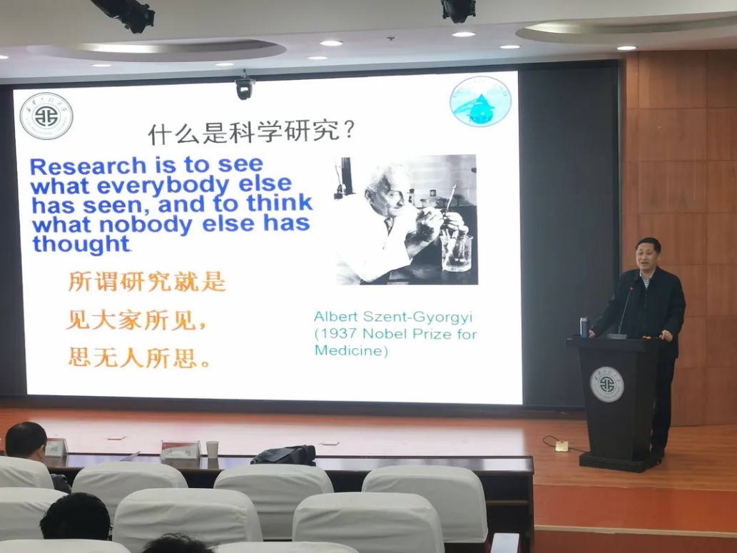 黄翔教授结合自身科研经历就科研成果三要素:重要、创新、透彻,联系学科知识,科学史等,向大家介绍了如何做出好的科研成果,强调了选好研究方向,寻找解决问题的方法以及坚持不懈的努力的重要性。他要求同学们在科研创新过程中要及时寻求老师指导,注重团队合作;要多查阅相关研究资料,注意转换思维模式与角度;要做到知行合一,提升书面及口头表达能力。黄翔希望研究生同学们能做到一(一直有研究的热情与激情)、十(精读本专业的十本经典教材)、百(与一百名名师名家交流请教)、千(阅读一千篇文献资料)、万(学习一万个小时)。他最后以姚穆院士“希望你们拓宽视野,创新探索,团结协作,勤奋工作,献身事业,勇攀高峰,为祖国建设作出自己的贡献”的寄语勉励大家。