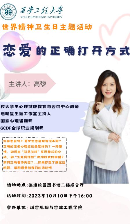下半场邀请了我校大学生心理健康教育与咨询中心高黎老师在临潼校区图书馆二楼报告厅,做了题为“恋爱的正确打开方式”的主题报告,学院200多名师生参加了报告会。高黎老师从“理解爱情”“大学生常见情感困扰”“恋爱的正确打开方式”等方面,通过师生互动、多重角度、多个事例、多种方式的讲解让同学们了解了什么是正确的爱情观、如何树立正确的恋爱价值观。报告会在轻松愉悦的氛围中进行,也让同学们再次感受到了心理健康教育带给大家的快乐。
