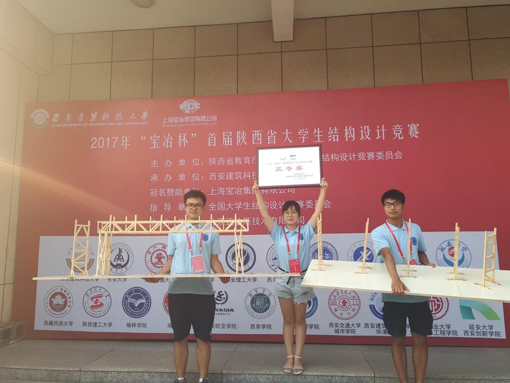 由学院土木系师生组成的“筑梦起航”代表队,于2017年7月1日至2日,参加了在西安建筑科技大学举办的“宝冶杯”首届陕西大学生结构设计竞赛。经过紧张角逐,学院代表队凭借作品“清水桁渡”喜获大赛三等奖,为我校争得了荣誉,填补了我校土木工程专业在高级别专业竞技比赛中的空白。